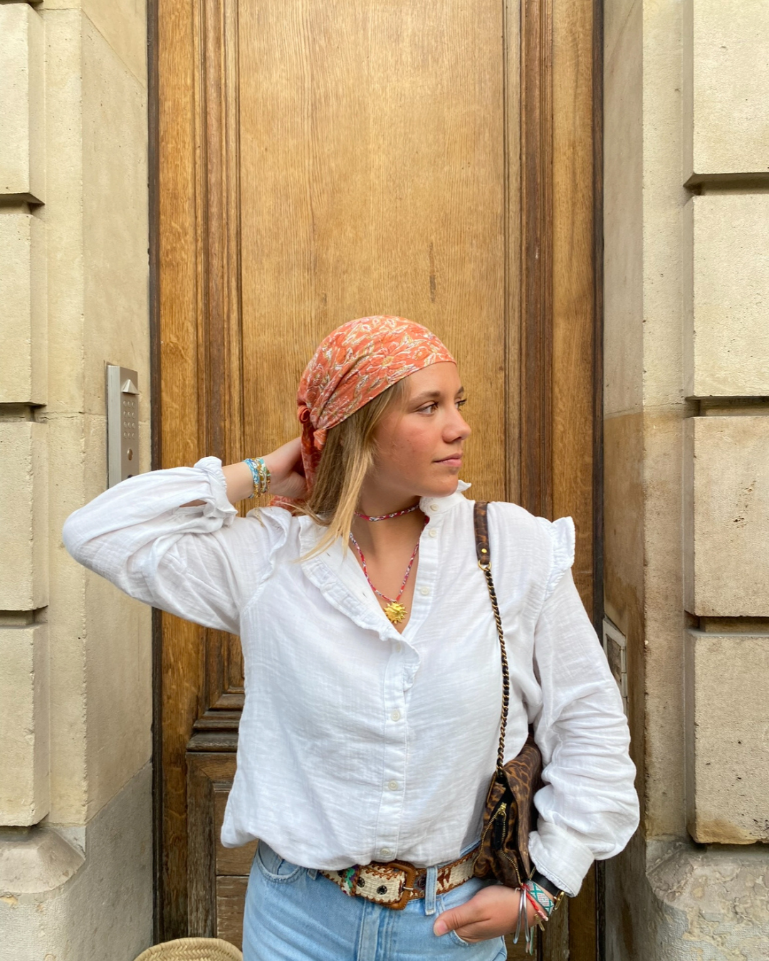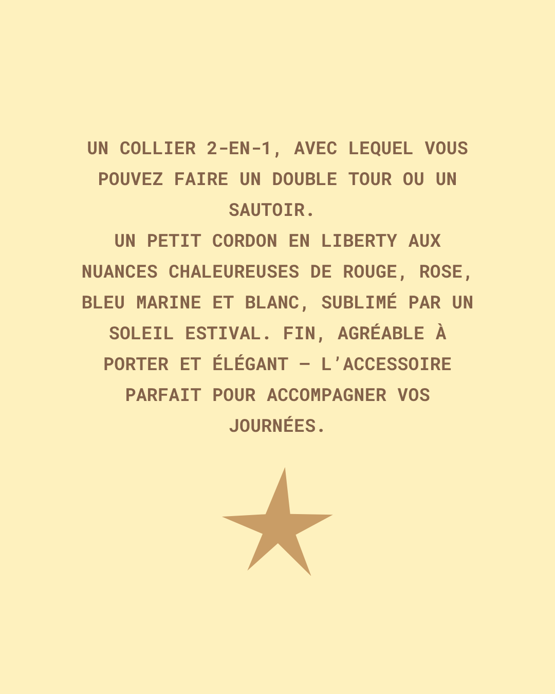 Un petit cordon en liberty aux nuances chaleureuses de rouge, rose, bleu marine et blanc, sublimé par un soleil estival. Fin, agréable à porter et élégant